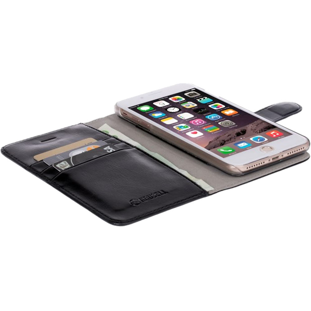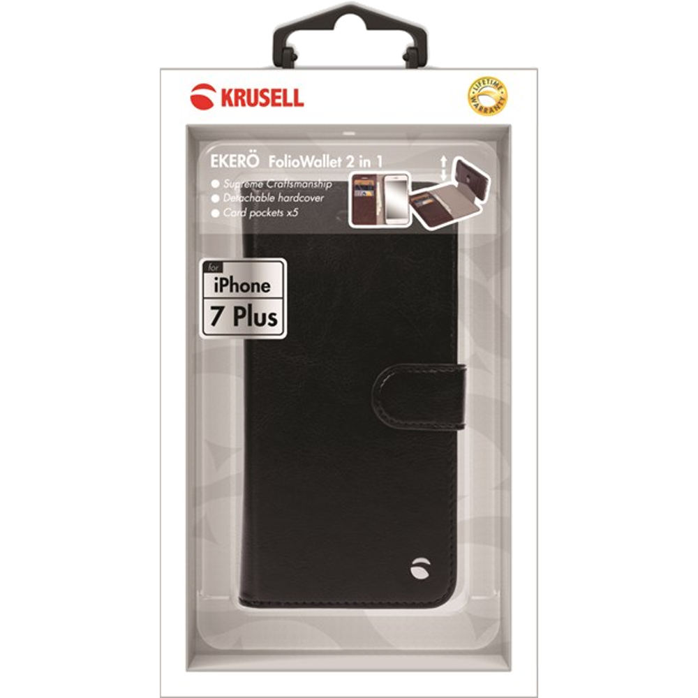Krusell sort Ekerö FlipWallet 2in1 er en fliptaske til iPhone 7 Plus, som beskytter telefonen både på front og bagside. Ekerö FlipWallet 2in1 består af et cover med en kreditkort lomme, som kan tages af tasken. Tasken har plads til adskillige kreditkort, og har ligeledes stand funktion.