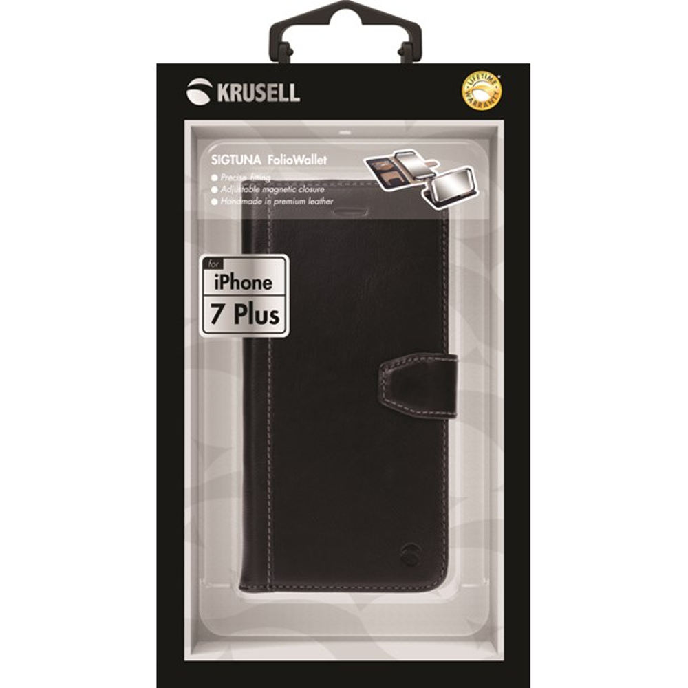 Krusell sort Sigtuna FolioWallet i ægte læder er en fliptaske til iPhone 7 Plus, som beskytter telefonen både på front og bagside. Tasken har trods sit slanke design fået plads til flere kreditkort lommer.