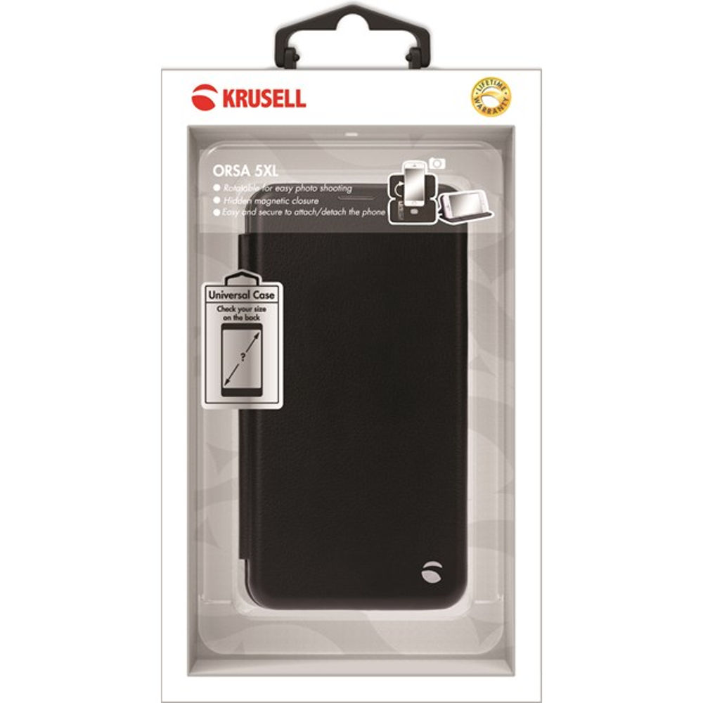 Krusell sort Orsa FolioCase Universal 5XL er en fliptaske, som beskytter telefonen både på front og bagside. Tasken har trods sit slanke design fået plads til kreditkort lomme.