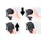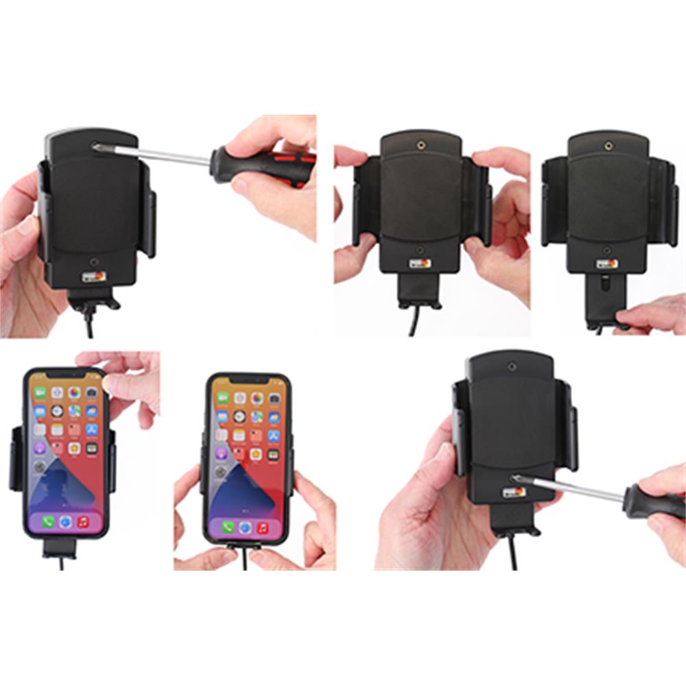 Man løsner skruerne, tilpasser bredden, strammer skruerne og den er klar til at blive taget i brug. Får man en ny størrelse cover, gentages tilpasningen og holderen vil igen passe perfekt. Holderen kan således udvides mellem 61-83 mm's bredde. Vær opmærksom på at man også kan justere højden for telefonens placering, så den rammer ladefeltet korrekt.