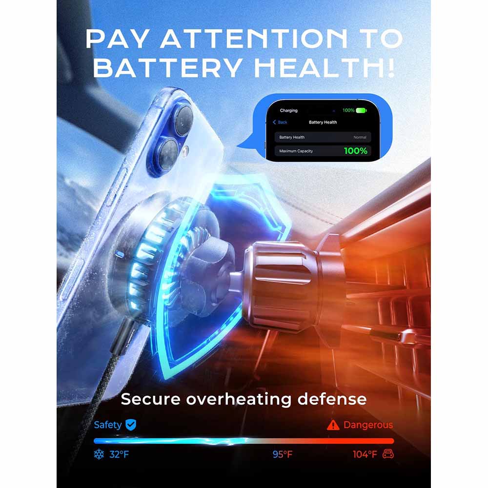 Når der sættes en telefon på holderen, vil den indbyggede blæser starte automatisk. Du kan også selv aktivere den ved en let berøring på touch knappen ovenpå holderen, med sne fnug symbolet. Så bliver telefonens ladeområde lynhurtigt kølet ned og ladningen kan fortsætte. Du vil sætte pris på denne funktion om sommeren, hvor telefon sidder på holderen, der måske er placeret højt på dashboardet og solen varmer den op.